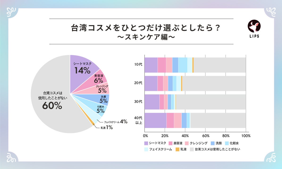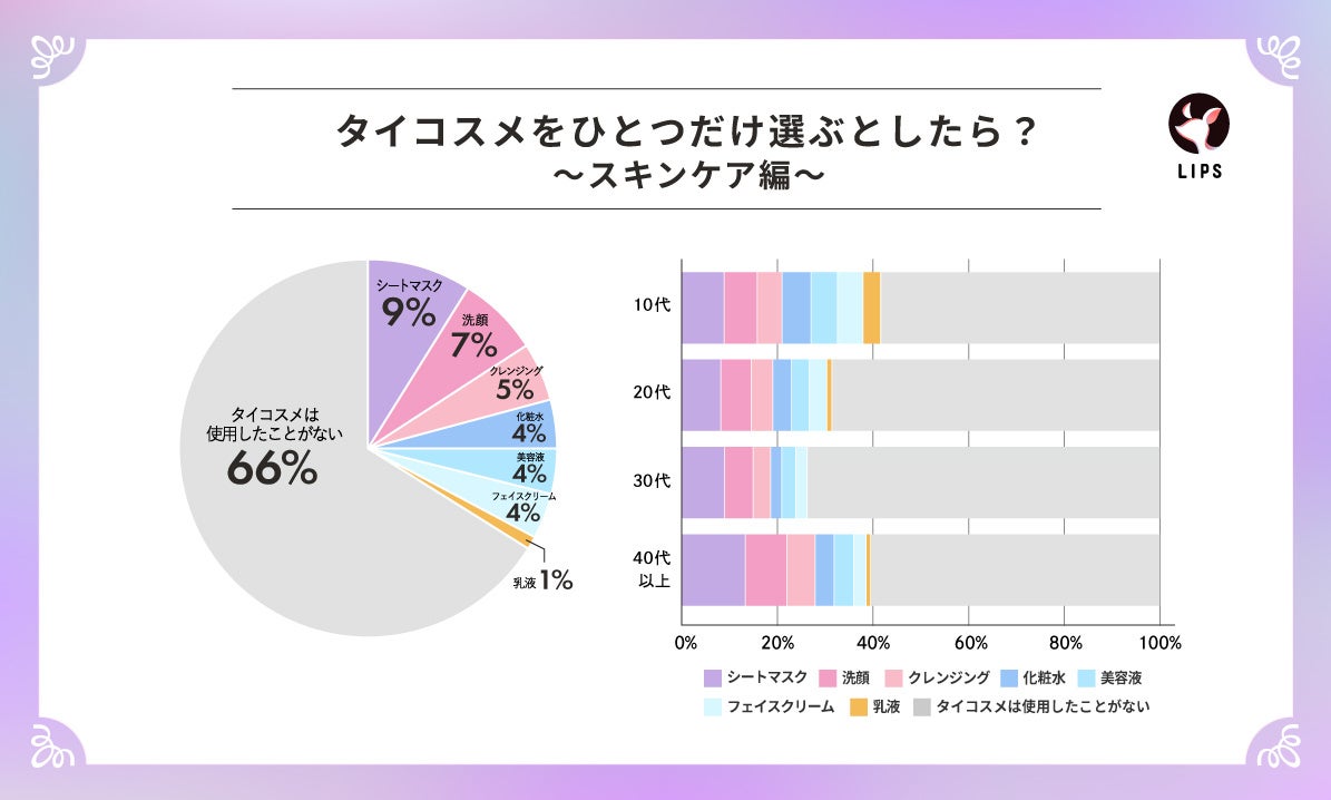 スキンケアに関しては、ポイントメイク・ベースメイクに比べると、まだ使用したことがない人は多いことがうかがえます。お試ししたことがある人に限ると、10代、40代以上を中心にシートマスクに支持が集まる結果となりました。