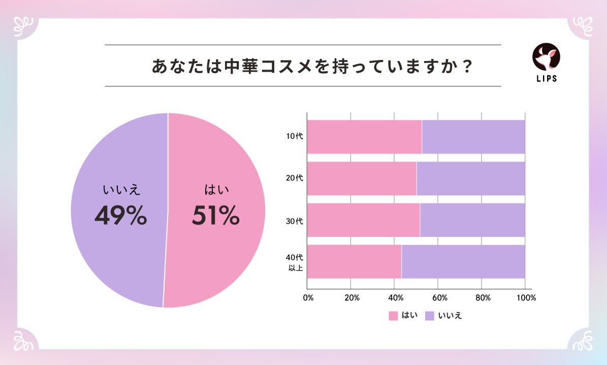 前回の調査では、韓国に次いで注目されていることがわかった中華コスメ。「あなたは中華コスメを持っていますか?」という質問に対し、2人に1人が中華コスメを持っていることが判明。