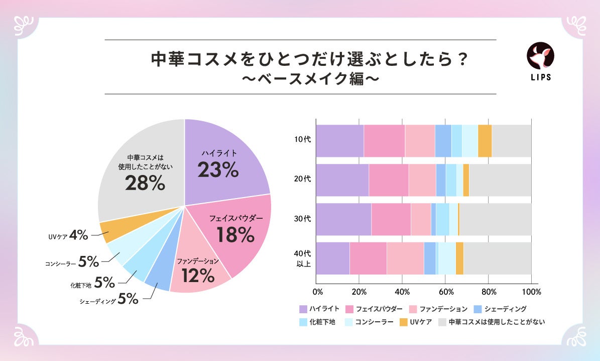 ベースメイクについては、メイクの仕上がりを格上げしてくれるアイテムであるハイライト(23%)やフェイスパウダー(18%)が、それぞれ1位・2位という結果に。