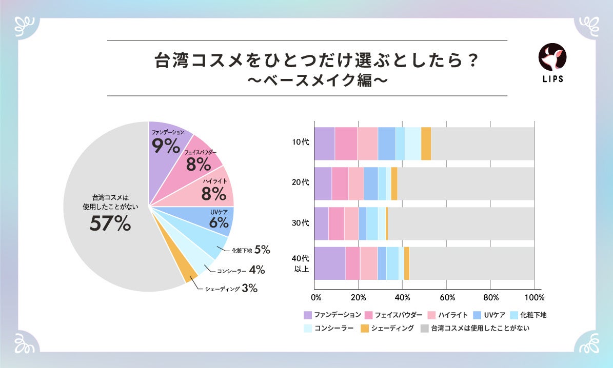 台湾のベースメイクについては、ファンデーション、フェイスパウダー、ハイライトなど、それぞれのアイテムに人気が分散する結果となりました。