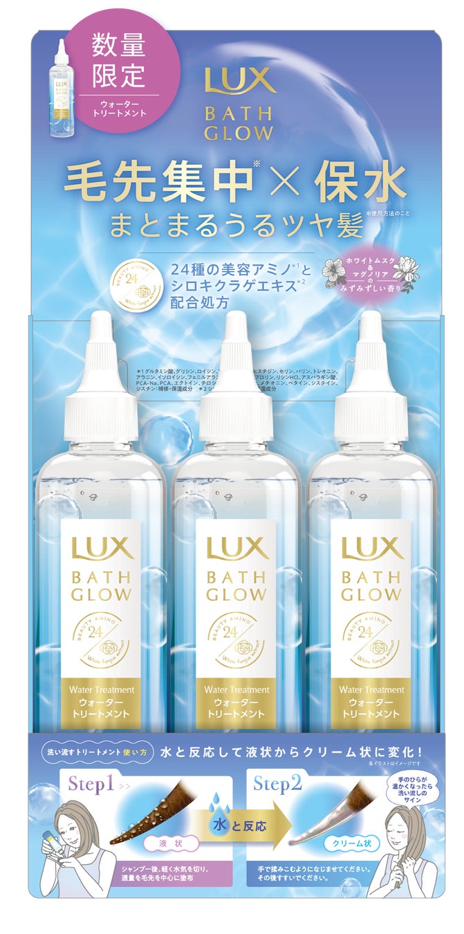 「ラックス バスグロウ ウォータートリートメント」が数量限定で新登場します。“保水ケア美容”の一環としてバスグロウ各シリーズと併せて使用することで、よりうるおいを実感でき、毛先のまとまり悩みにアプローチします。