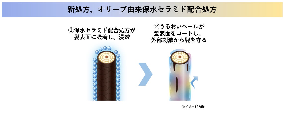 新処方オリーブ由来保水セラミド※6配合処方が髪表面に吸着・浸透し、うるおいベールで髪表面をコートすることで、ブラッシングの摩擦や乾燥等の外部刺激から髪を守り、うるツヤ髪が続きます。