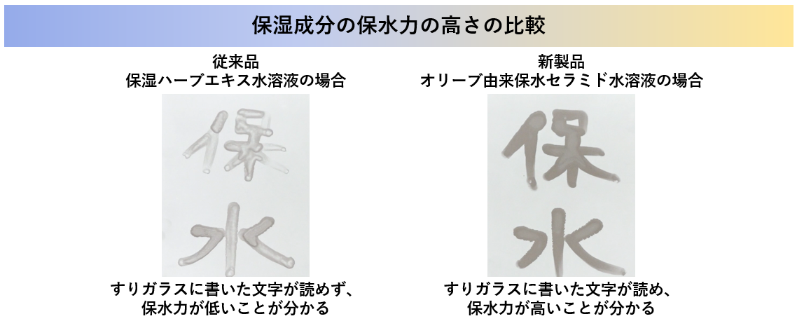 「保水」の文字を書く実験において、現行品の保湿ハーブエキス水溶液はすぐに乾いてしまうのに対して新製品のオリーブ由来保水セラミド水溶液はすぐに乾かずうるおいを保っていることを確認できました。保水力の高い成分を採用し、よりうるおいにフォーカスした製品になっています。