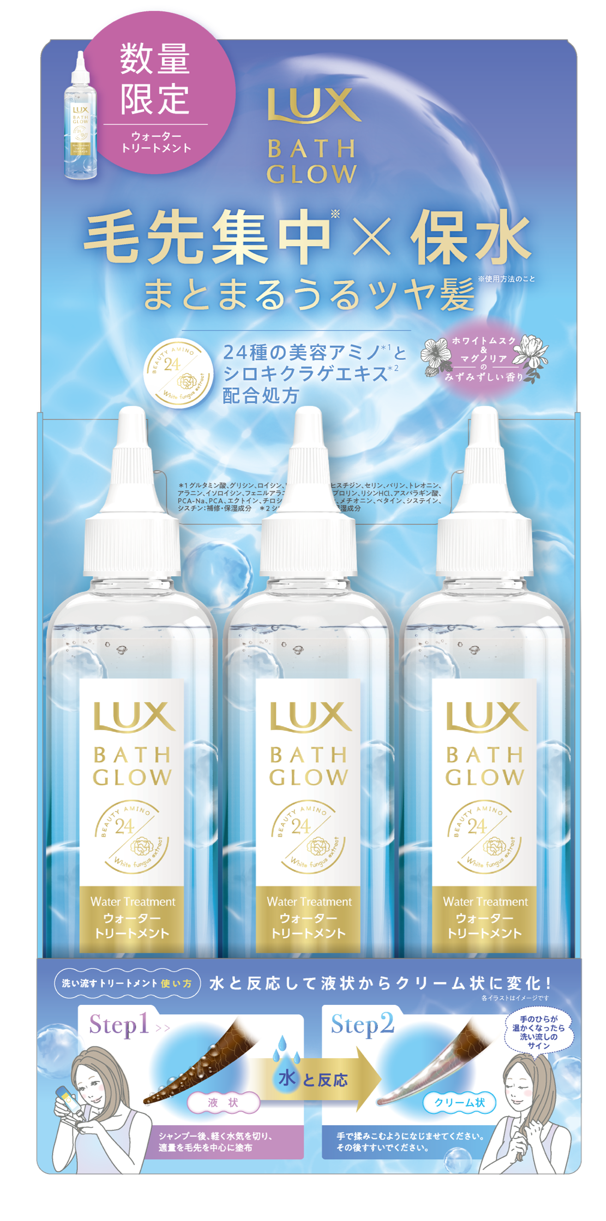 「ラックス バスグロウ ウォータートリートメント」が数量限定で新登場します。“保水ケア美容”の一環としてバスグロウ各シリーズと併せて使用することで、よりうるおいを実感でき、毛先のまとまり悩みにアプローチします。