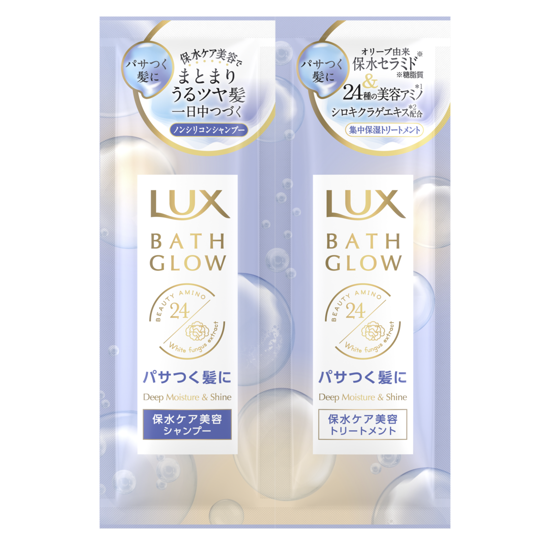 ラックス バスグロウ シリーズは “保水ケア美容”をコンセプトとした製品です。24 種の美容アミノ※3と、高級化粧品にも使用されている、保水力の高いシロキクラゲエキス※4を配合した処方で、髪の芯までうるおいを届けると同時に、髪のダメージを補修し、時間が経ってもうるおい続けるツヤ髪を叶えます。