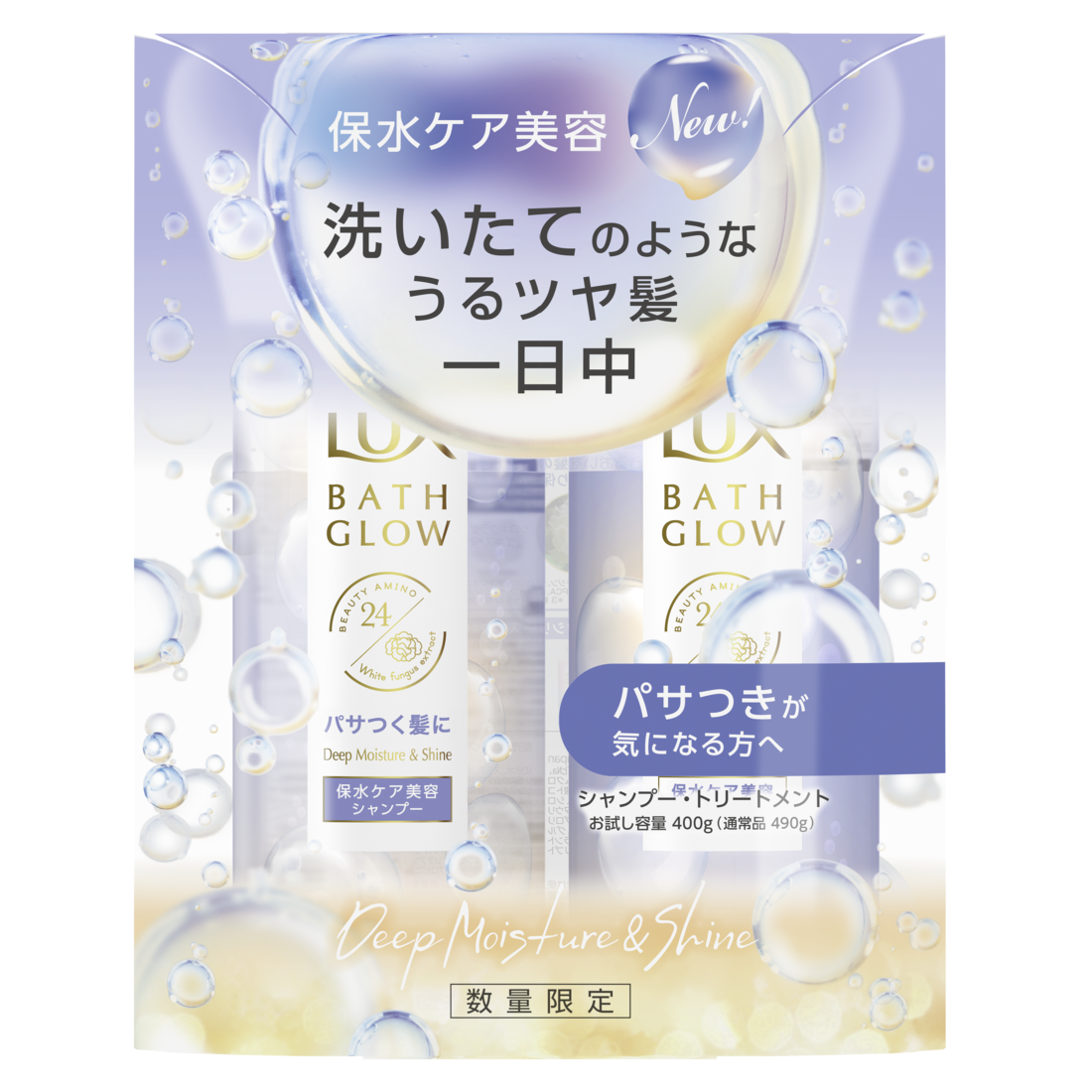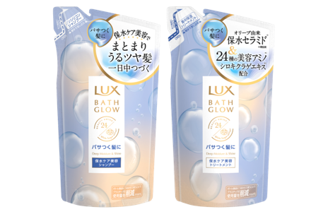 そんなバスグロウ シリーズの「モイスチャー&シャイン」をアップデートした新製品「ラックス バスグロウ ディープモイスチャー&シャイン」を9月18日(月)より全国で発売します。うるおいの機能性を高めた保水ケア美容シャンプーで、一日中続く洗いたてのようなうるツヤ髪をお楽しみください。