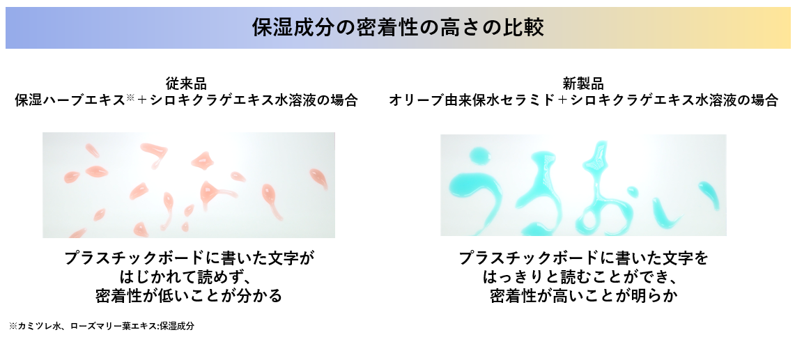 従来品の保湿成分※7水溶液と新製品の保湿成分水溶液を用いてプラスチックボードに「うるおい」の文字を書く実験では、画像の通り新製品の保湿成分の文字は読むことができ、従来品の保湿成分に比べて密着性に優れていることが分かります。