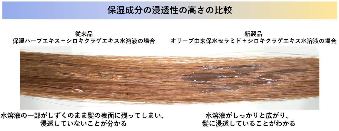 それぞれの保湿成分水溶液を毛束に滴下する実験では、従来品の保湿成分水溶液は一部がしずくのまま残ったのに対し、新製品の保湿成分水溶液はすぐに広がって髪に浸透することが確認できました。髪全体へしっかりと行き渡る保湿成分を採用し、処方設計をアップデートしています。