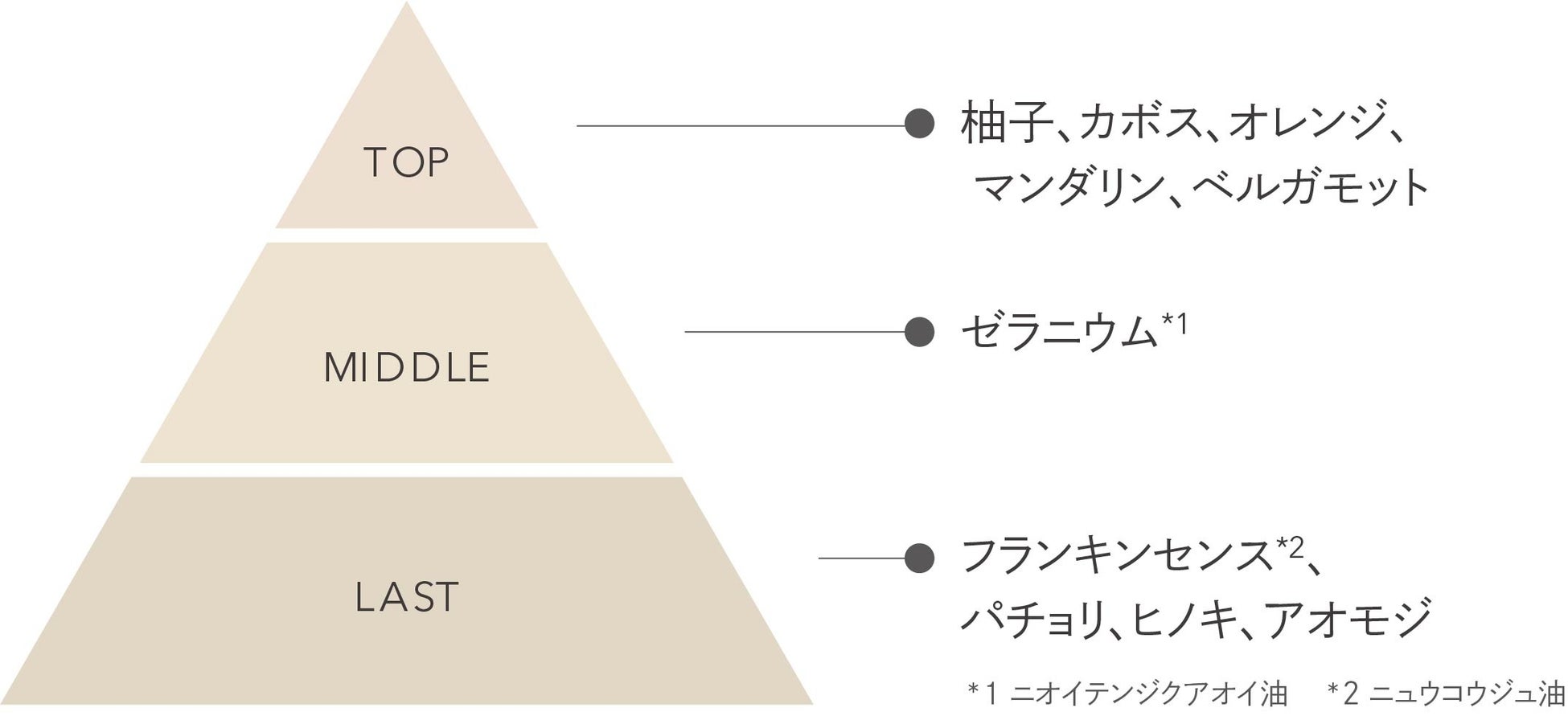眠りにつく前におすすめなナイトブレンドとして、新たに国産のカボス精油を加え、柚子を基調にゼラニウム*13やパチョリ、オレンジ、ベルガモット、フランキンセンス*14、ヒノキといった、樹木や果実、葉から抽出した10種類の精油をブレンド。清らかに澄み渡るトップノートから、ウッディな落ち着き、そして凛とした余韻が残る香りの奥行きが、眠りにつく前のゆったりとした時間を彩ります。