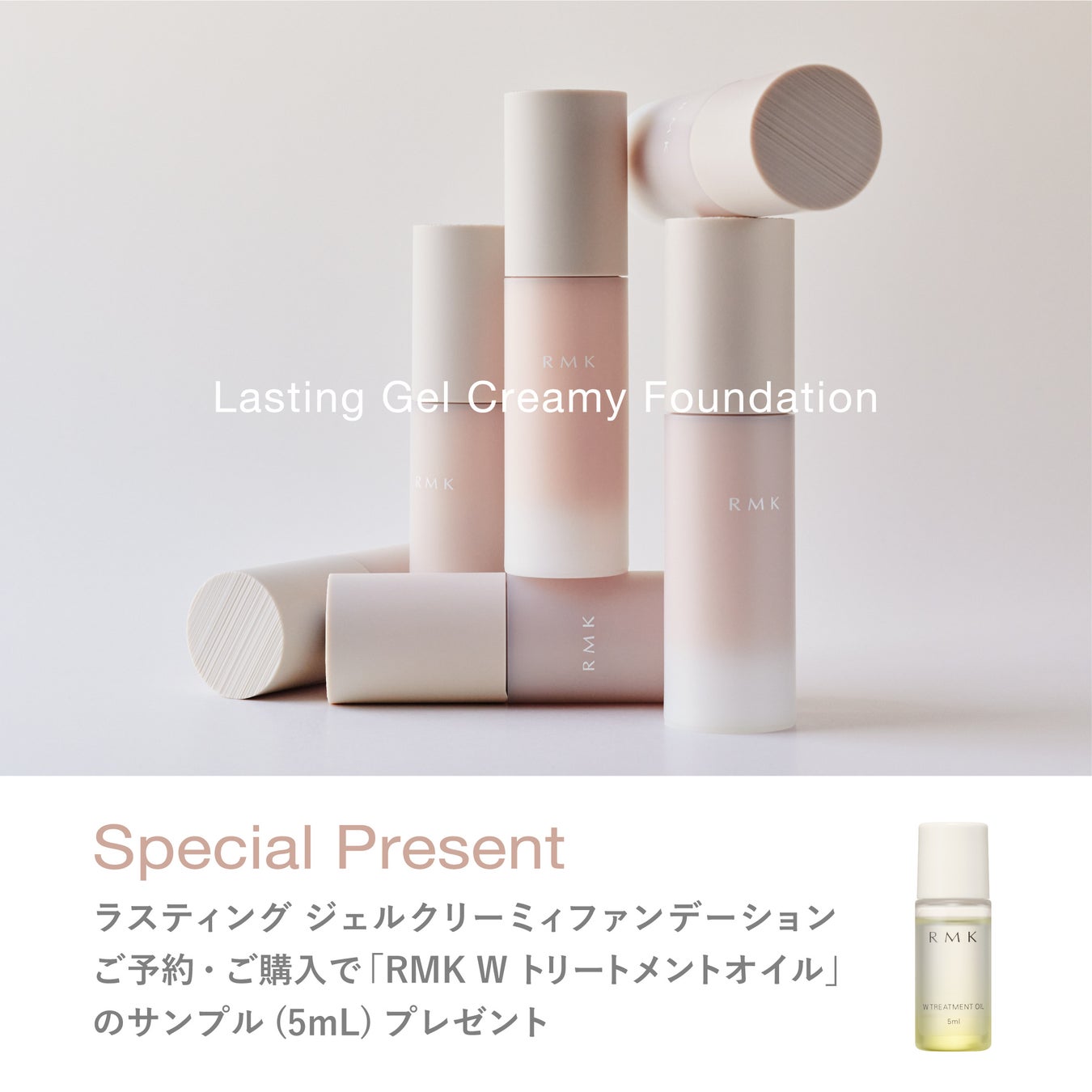 8 月 18 日(金)より、全国の RMK コーナーおよび公式オンラインショップにて、9 月 1 日(金)新発売「RMK ラスティング ジェルクリーミィファンデーション」をご予約・ご購入いただいたお客さまに、人気の「RMK Wトリートメントオイル」 のサンプル(5mL)をプレゼント。