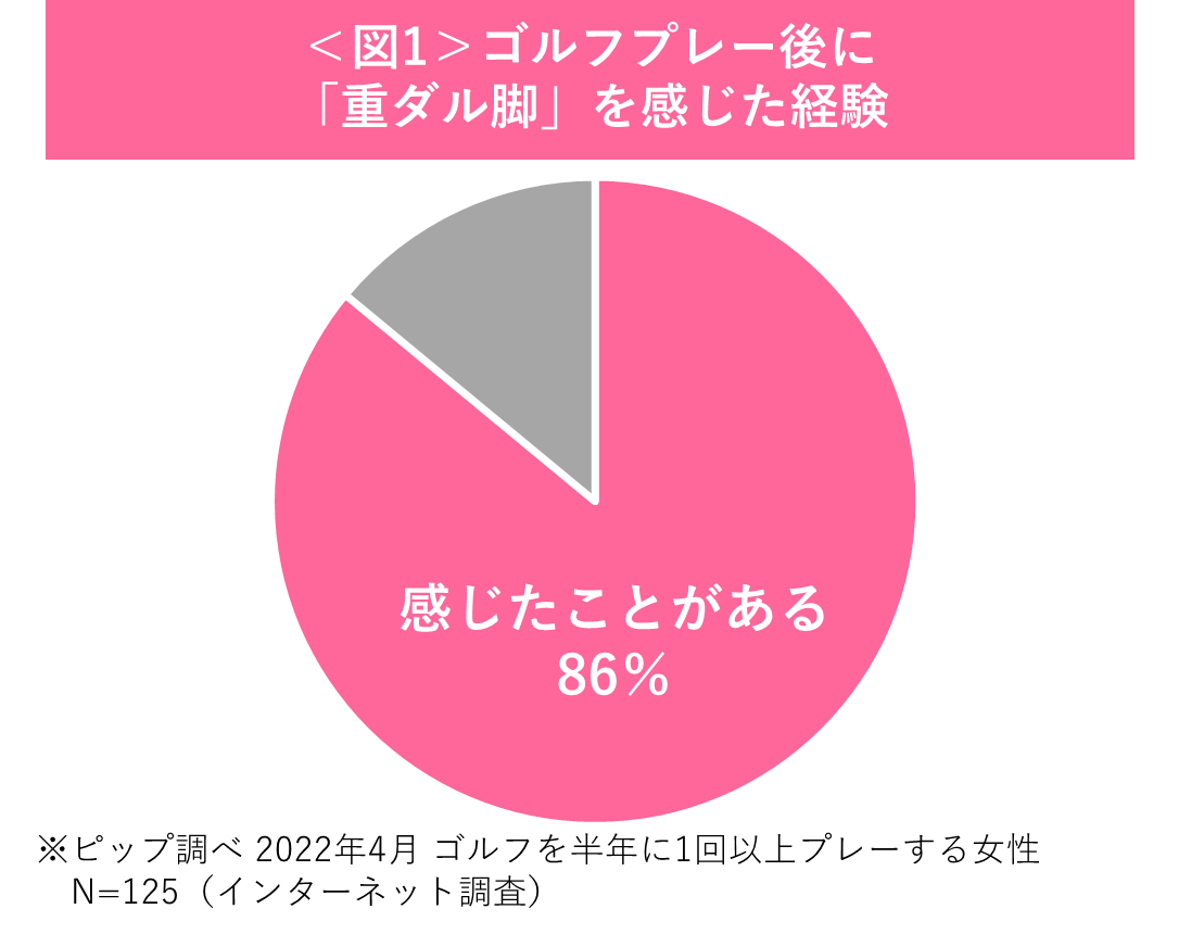 ピップが2022年4月に行った調査によると、プレー後に脚の重ダルさを感じたことがある女性は86%と、多くの人が脚の不調を感じていることが明らかとなりました。<図1> また、ゴルフ女子の中にはファッションを楽しんでいる人も多く、プレー中に美脚に見せたいというお声もあります。