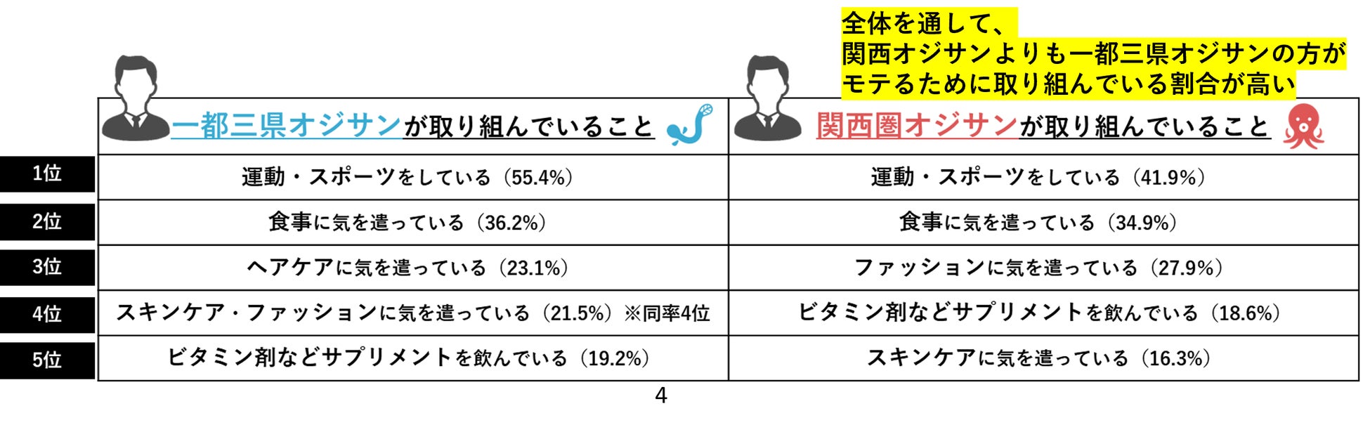 地域別で見ると、一都三県オジサンの方が関西圏オジサンよりも見た目をケアしている人の割合が9.2%多く、若々しく見えるオジサンが多いかもしれません。