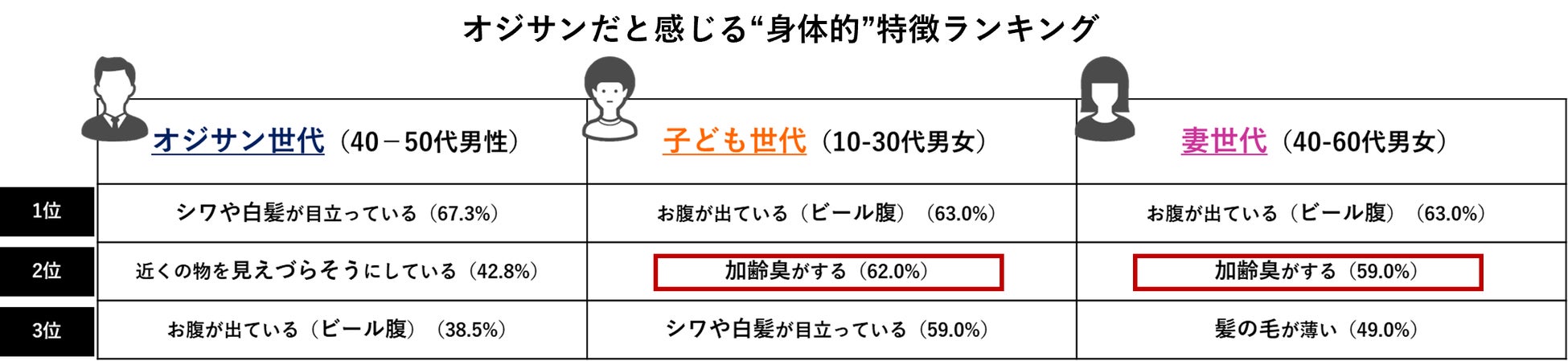 「オジサンだと感じる、“身体的”な特徴は何ですか。」という質問に対し、40-50代男性(以下、オジサン)はシワや白髪、お腹が出ているなど目に見える症状を選択する傾向が強く、10-30代男女(以下、子ども世代)や40-60代女性(以下、妻世代)については、約6割が「加齢臭」を選び、その他「強い口臭」については子ども世代で42.0%、妻世代で36.0%が選択する結果となりました。