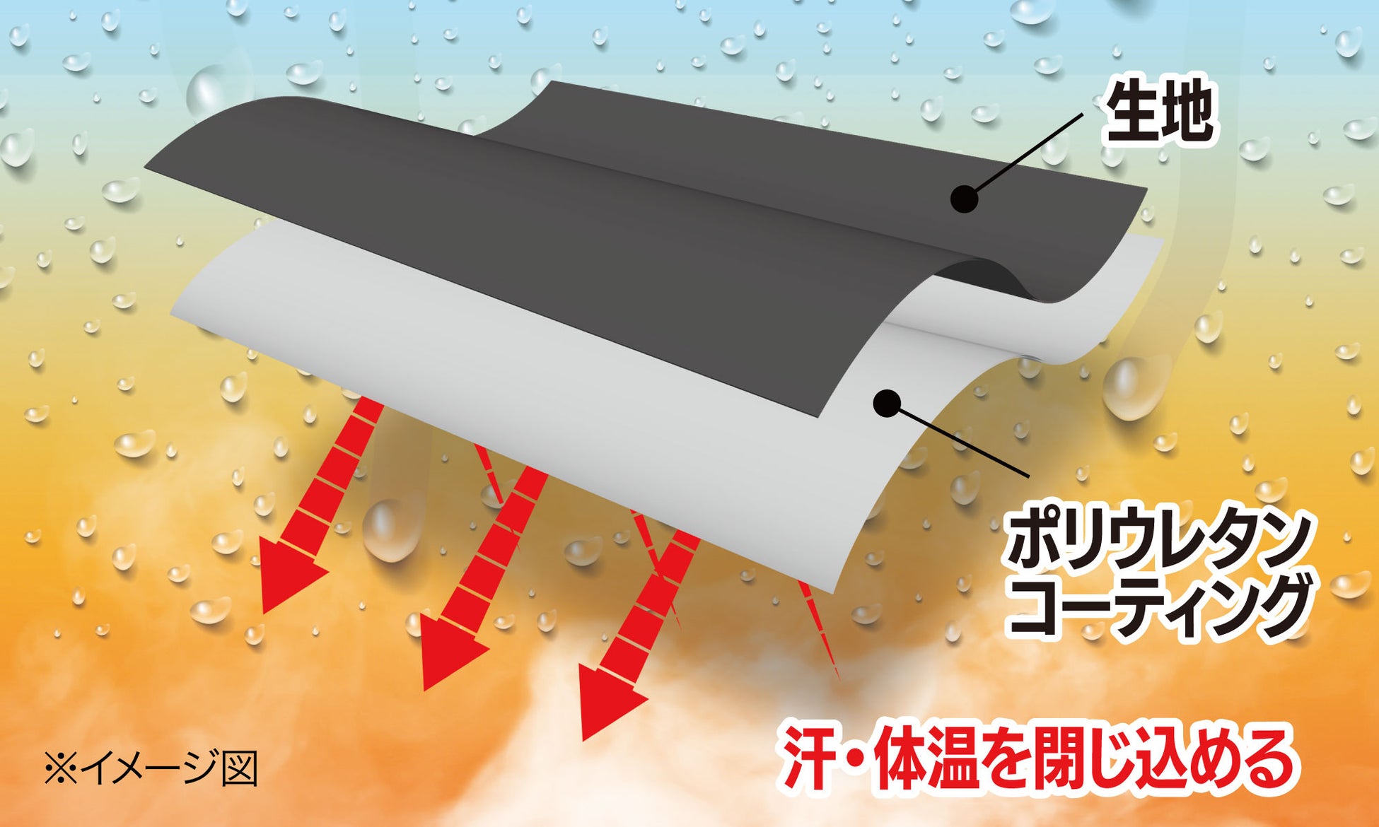 生地内側に気密性に優れたポリウレタンをコーティングすることにより、内側からの熱を逃がしにくく、発汗をサポート!