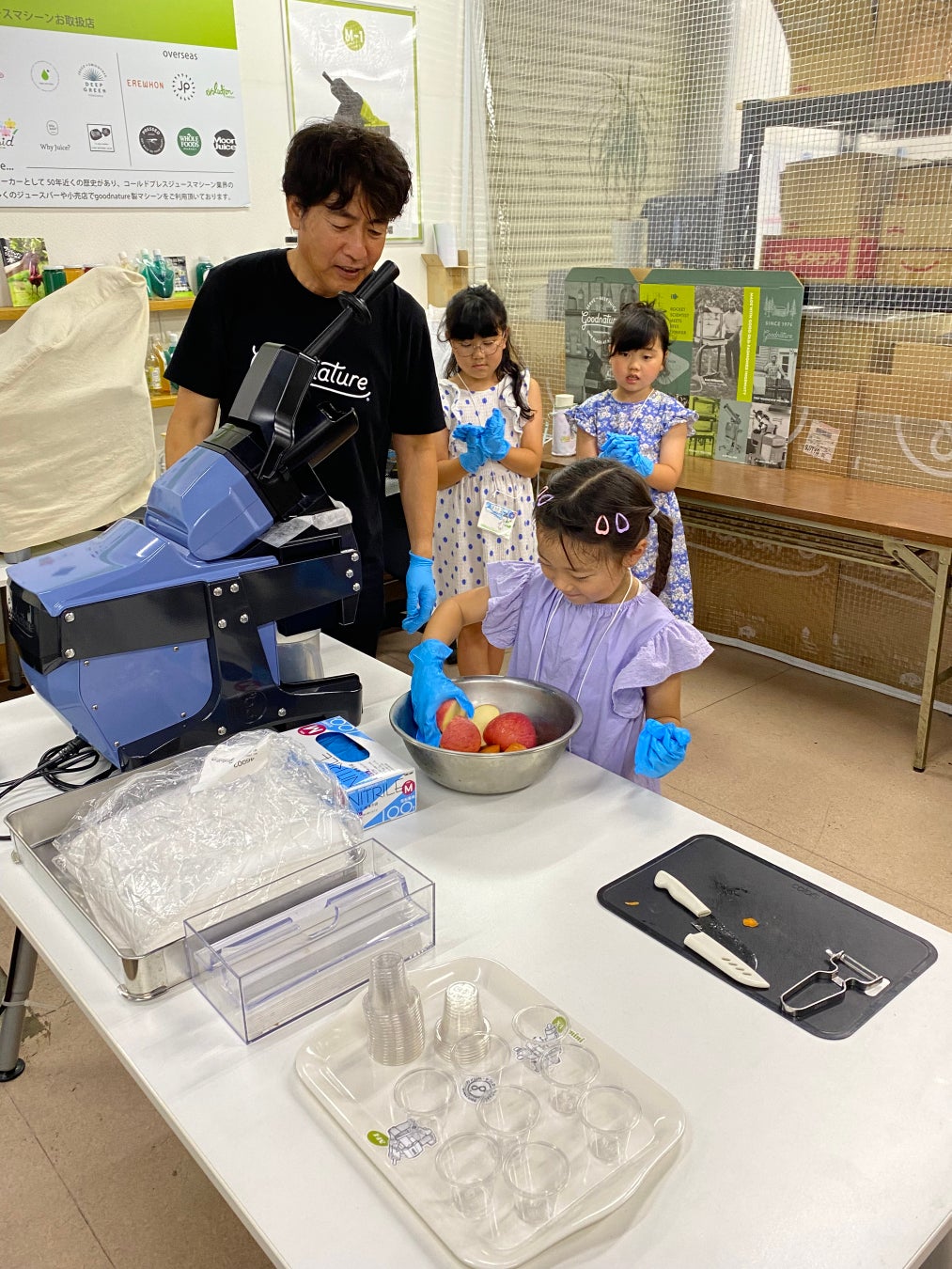 次は、”コールドプレス” ジュースの搾汁体験。 子供たちは 、野菜の栄養価をそのままジュースにする”コールド