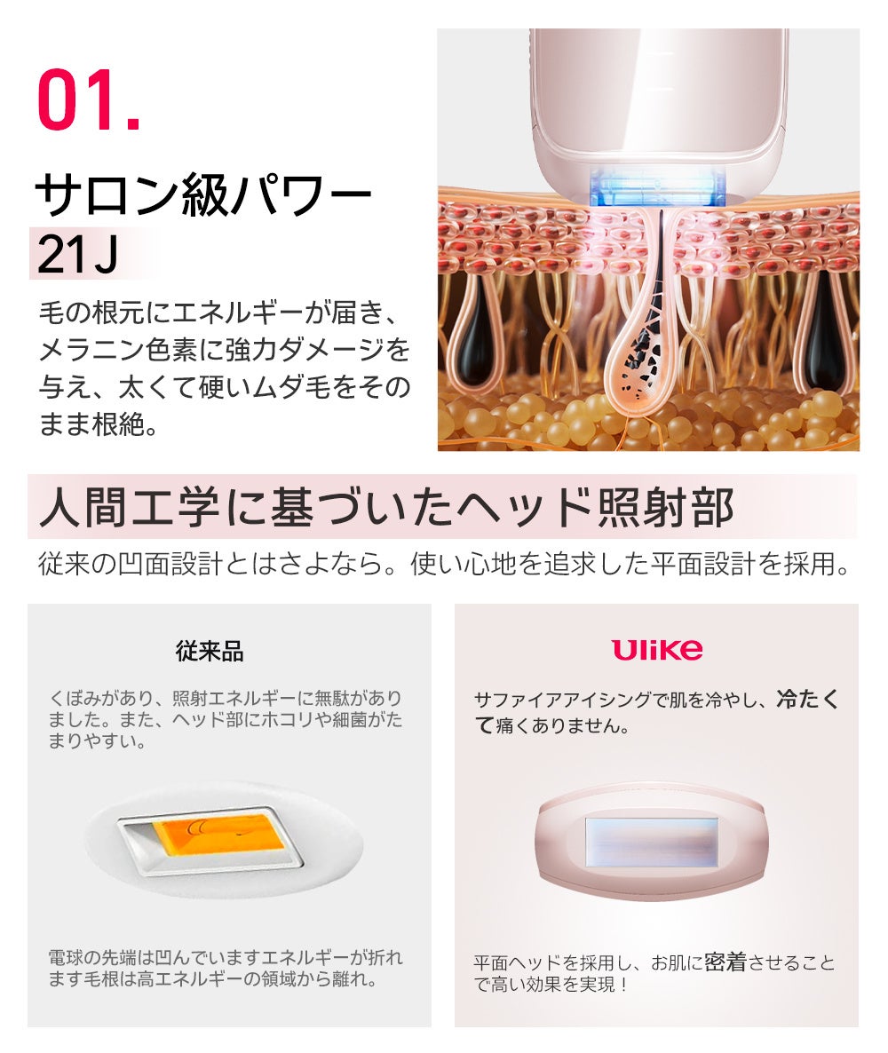 ▼特徴1|21ジュールの出力エネルギーで、自宅でサロン級ムダ毛処理