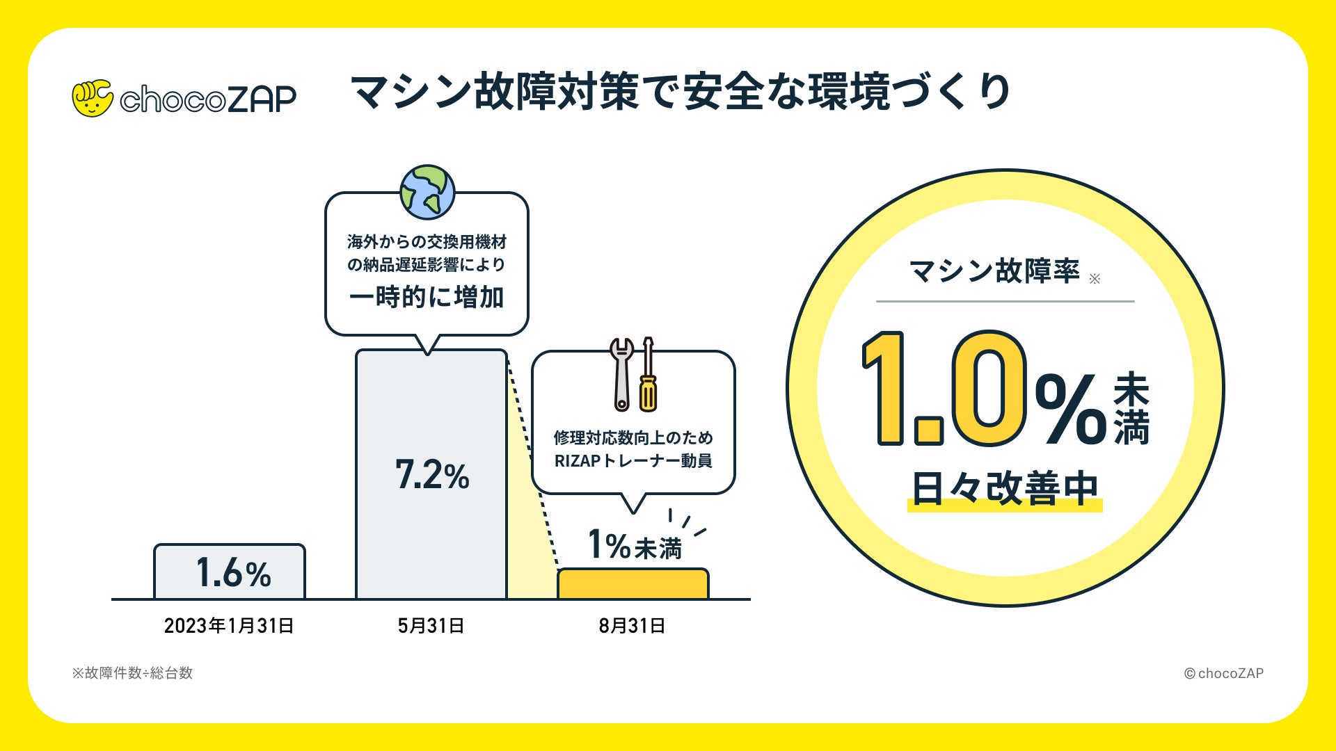 また、一般的に、24時間365日稼働の無人ジムのマシンは、その稼働時間の長さから故障率は高くなりがちです。chocoZAPにおけるマシンの故障率は、当初(今年1月末)で1%程度で推移していましたが、この春先から発生した海外からの交換用機材の納品遅れの影響により、故障率は一時的に高くなり、5月末7.2%となりました。この時期に、ご希望のマシンが利用できずご不便をおかけした一部の会員の皆様には、深くお詫び申し上げます。