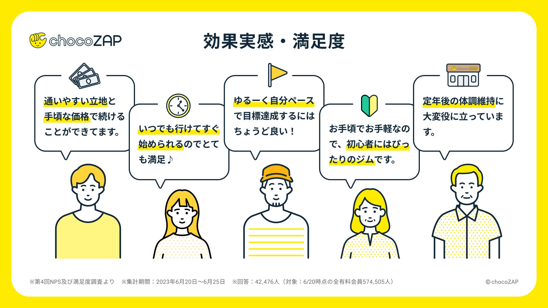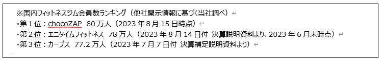 「chocoZAP」は、日経トレンディにおける「2023年ヒット予測100」で「コンビニジム」として総合1位(2022年11月発表)を獲得するなど、幅広いメディアでの大きな反響を頂く中で、chocoZAPへの入会者は当初の計画を上回るペースで増加し続けており、急成長を遂げてまいりました。サービスを開始して、1年未満で国内880店舗(2023年8月15日現在)を出店、さらに、2023年8月15日時点で、会員数は80万名となり、サービス開始から約1年で、国内フィットネスジムにおいて、日本一の会員数※を達成いたしました。