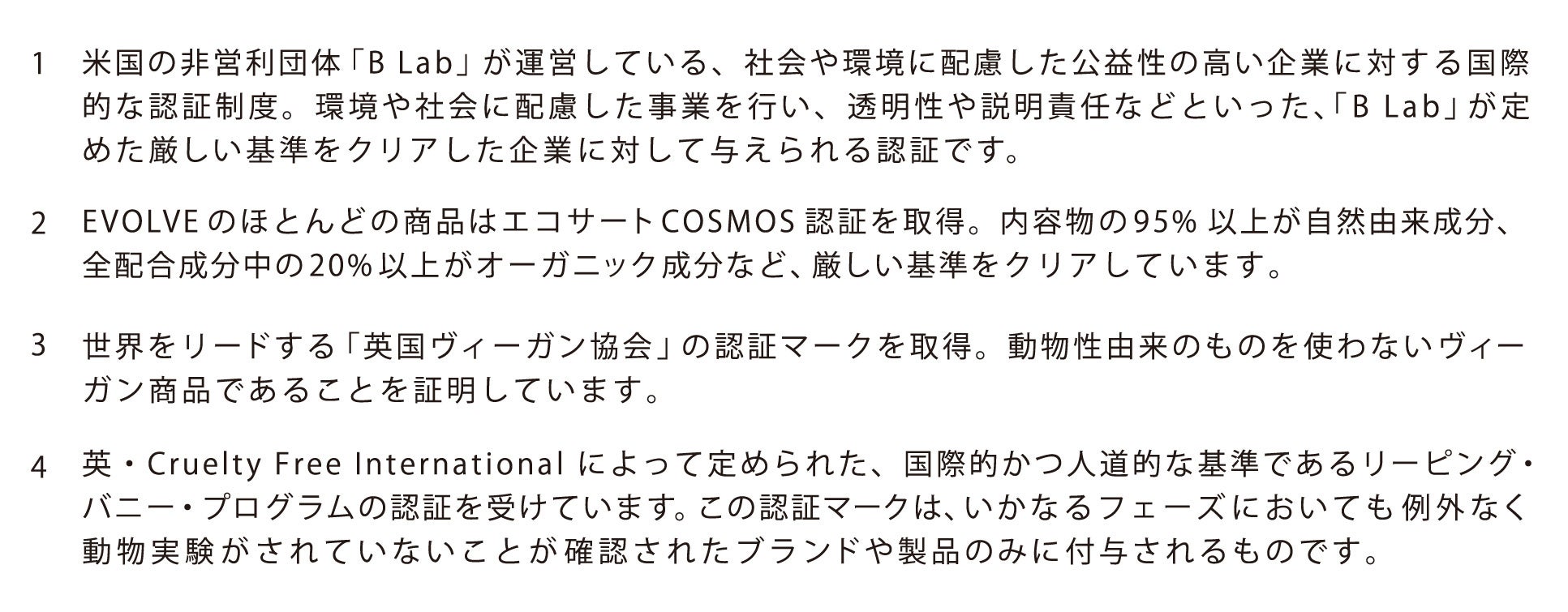 今回展開する『EVOLVE』は、日本ではまだ少ない「B Corp認証」取得企業です。商品はもちろん、企業として社会や地球環境に貢献していることが証明されています。肌と地球の両方をケアするというテーマは、地球環境に配慮しサステナビリティを追求するBeとしても大いに共感できるもの。日本初上陸となるEVOLVEのラインナップの中から、日本人の肌悩みにも寄り添える15アイテムを厳選して展開いたします。
