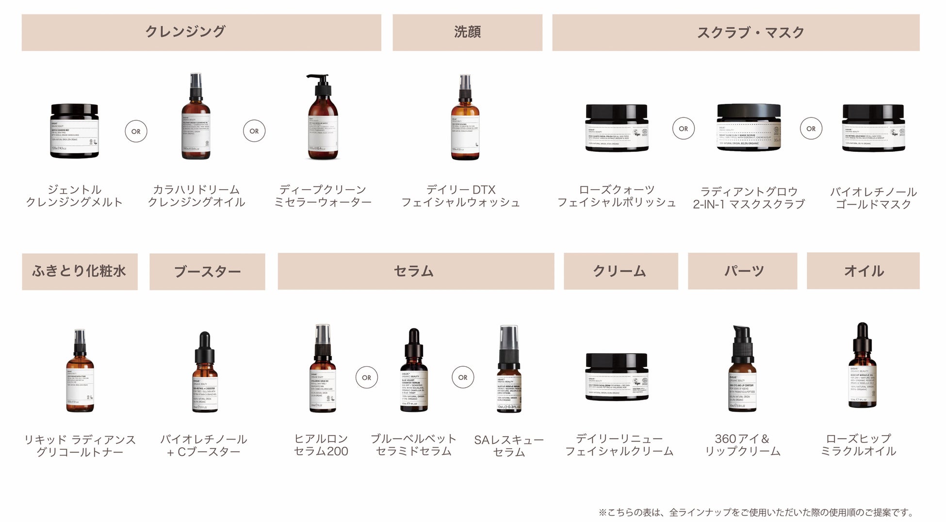 お肌のお悩みに合わせてセレクトいただけるラインナップ。クレンジング・セラム・フェイススクラブ(マスク)は3種類をご用意。オーガニック化粧品でありながら、ディープブルーのセラムやゴールドのマスクなど鮮やかなカラーを楽しんだり、みずみずしい香りや使用感の良さを実感していただける15種類の商品です。
