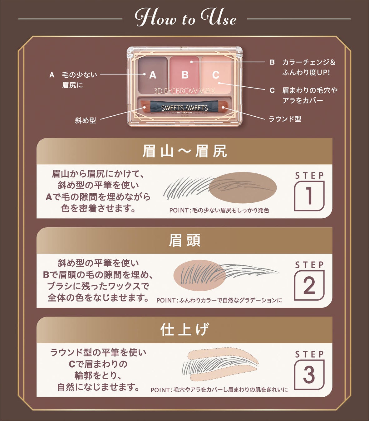 3Dアイブロウワックスは、ワックスを肌にのせるとパウダリーな質感にチェンジする「パウダーINワックス」処方。ふんわりとナチュラルな印象に仕上がります。