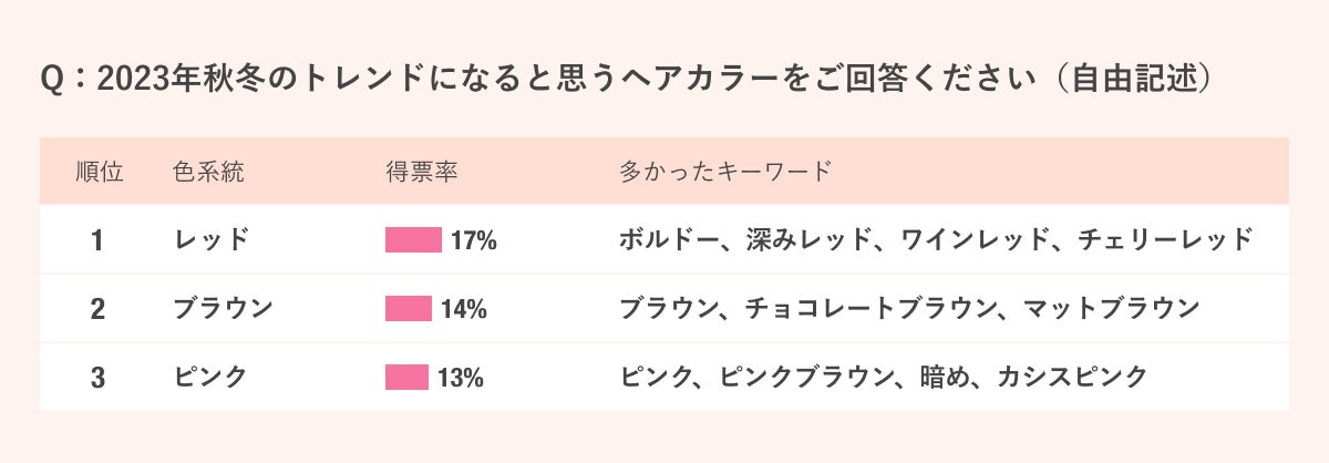 とくに人気のピンク系カラーとして「ピンクブラウン」や「カシスピンク」など、深みのある上品なピンクに回答が集まりました。