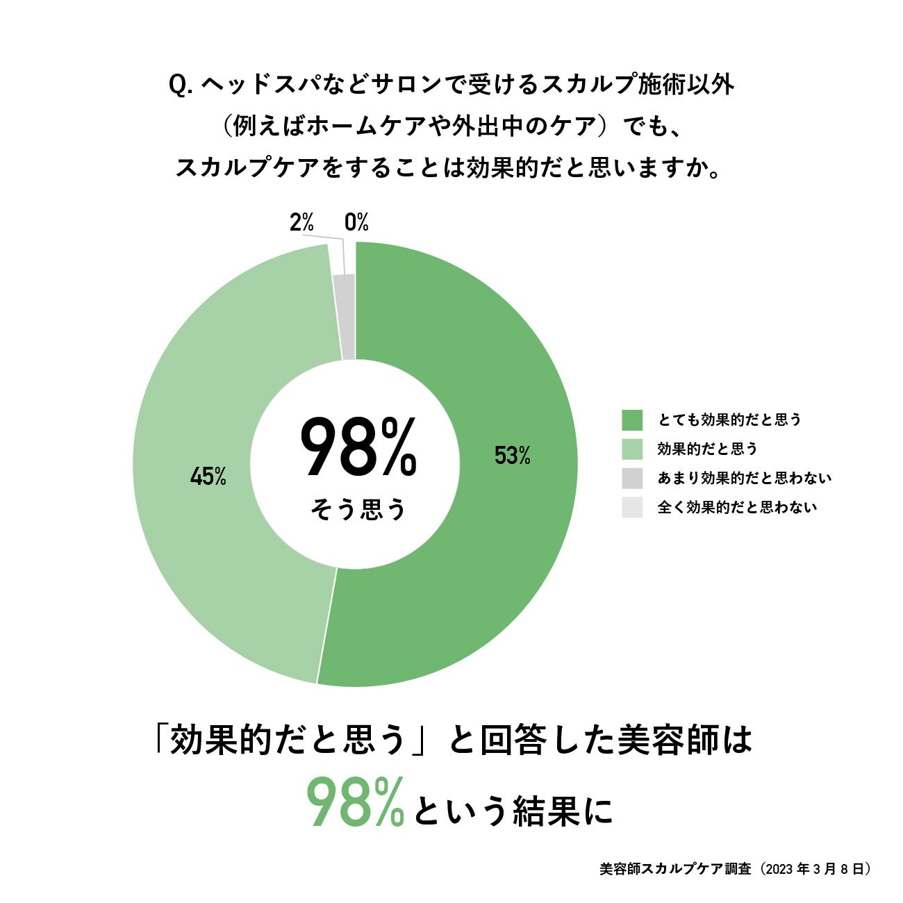 ヘッドスパなどサロンで受けるスカルプ施術以外(例えばホームケアや外出中のケア)でも、スカルプケアをすることは効果的だと思うかと聞くと、「とても効果的だと思う(53人)」、「効果的だと思う(45人)」と98人が答え、美容師がスカルプケアはサロンだけでなく、自宅や外出先でも継続的に行うことが効果的であると感じていることがわかりました。