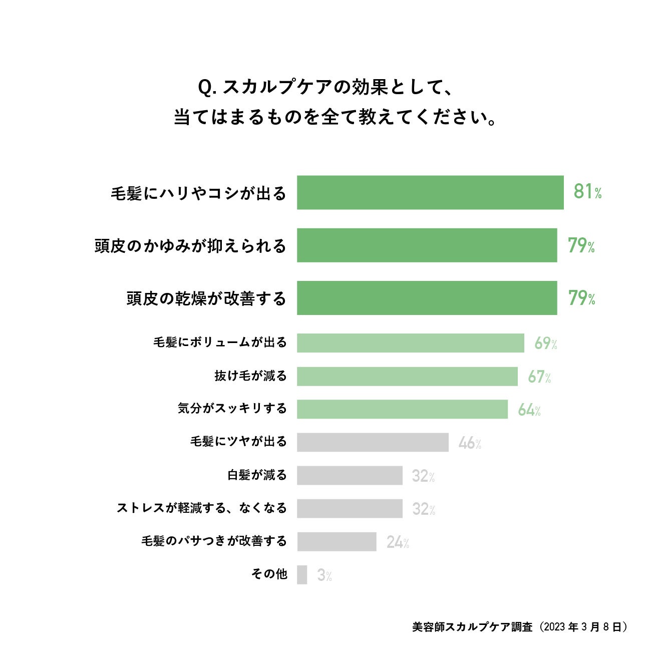 スカルプケアの効果として、当てはまるものを全て教えてくださいという質問に対しては、「毛髪にハリやコシが出る(81%)」という回答が頭皮に関連する「かゆみが抑えられる(79%)」、「乾燥が改善する(79%)」を上回る結果となりました。毛髪関連では「ボリュームがでる(69%)」「抜け毛が減る(67%)」「ツヤがでる(46%)」「白髪が減る(32%)」「パサツキが改善する(24%)」なども挙げられました。
