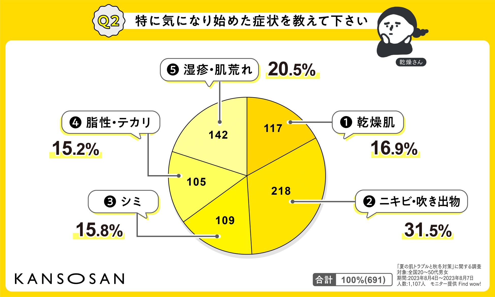 「特に気になり始めた症状を教えて下さい」という質問に対し、『ニキビ・吹き出物(31.5%)』『湿疹・肌荒れ(20.5%)』『乾燥肌(16.9%)』『シミ(15.8%)』『脂性・テカリ(15.2%)』と続きました。