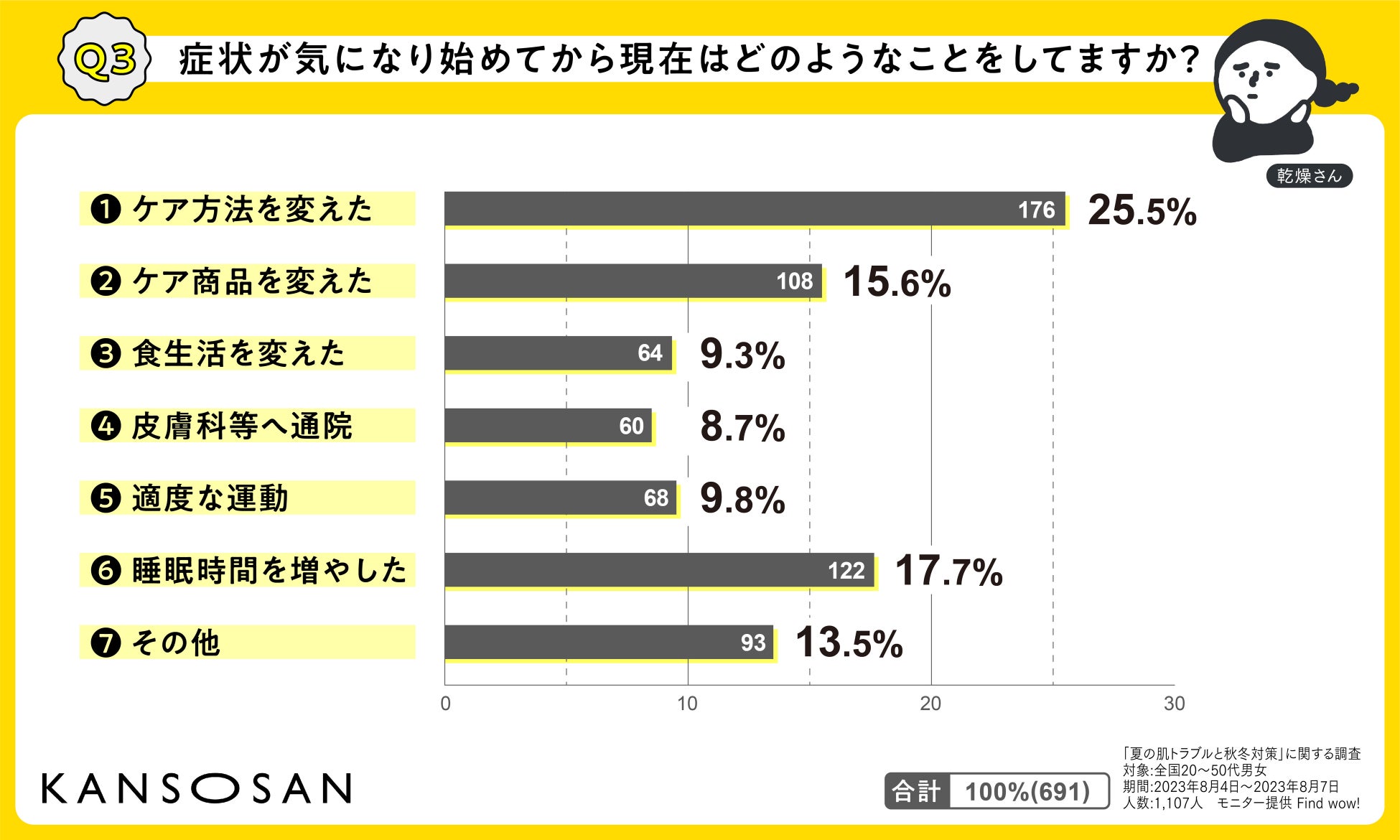 「症状が気になり始めてから現在はどのようなことをしてますか?」と質問したところ、『ケア方法を変えた(25.5%)』と回答した方が最も多く、次いで『睡眠時間を増やした(17.7%)』『ケア商品を変えた(15.6%)』『適度な運動(9.8%)』『食生活を変えた(9.3%)』と続きました。
