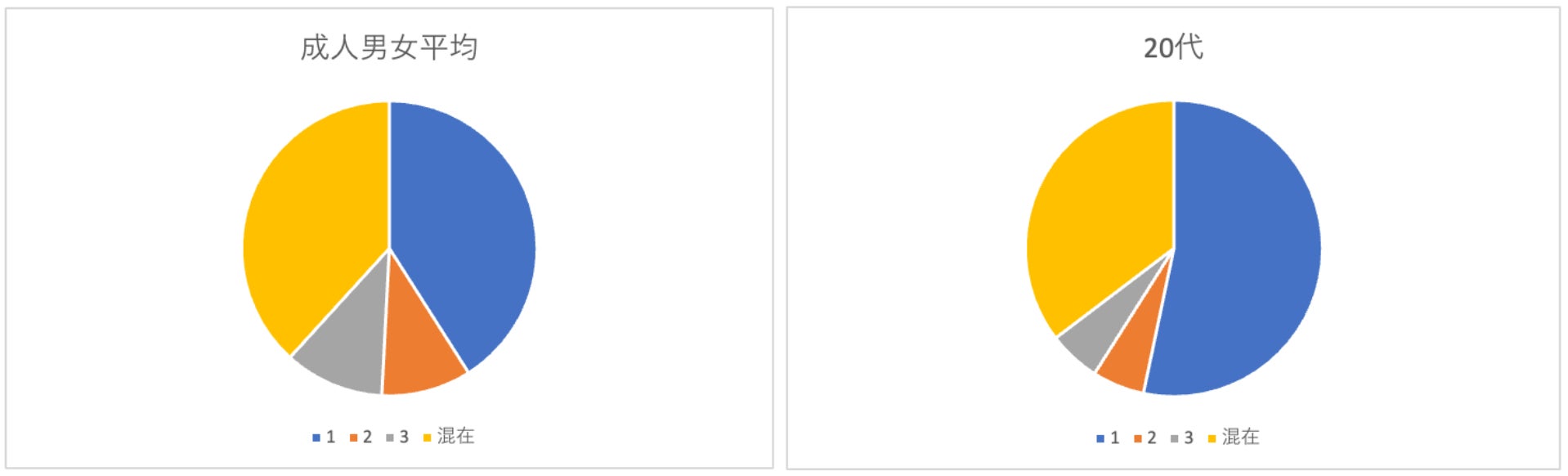型判定は腸内細菌叢のメタゲノム情報をいくつかのタイプに分類して臨床情報と比較しようという研究から生まれた考え方で、2011年にArumugamらによって提唱された「エンテロタイプ」を基に作成したものです。当社では独自の計算式で、「エンテロタイプ」で最優占種となるバクテロイデス、プレボテラ、ルミノコッカスのいずれかが最優占種と判定された場合に各々1型、2型、3型、そしてそのどれにも該当しない場合は「混在型」とする判定方法を用いて腸内細菌叢を分類しています。今回の解析では、20代から30代に関しては元来日本人に多いと言われていた3型(ルミノコッカスタイプ)と混在型よりも欧米在住者によく見られる1型(バクテロイデスタイプ)の割合が多い結果となりました。特に20代では1型が過半数を超えています。1型は脂肪の多い食生活との相関が見られるタイプです。今まではお肉中心の食生活の方が多いとされていましたが、コンビニ食など脂肪分が多い食事がメインになっている傾向が伺える結果となりました。