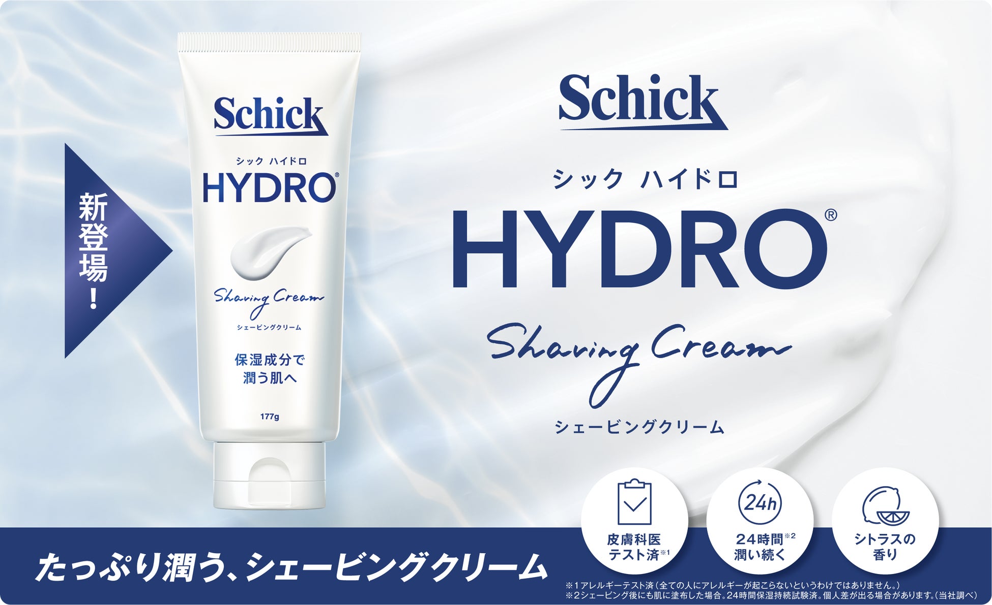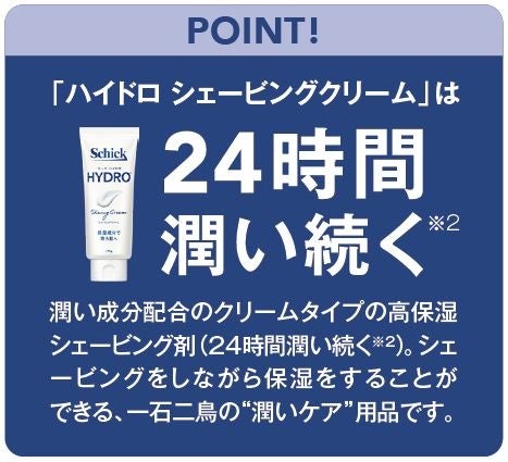「ハイドロ シェービングクリーム」は、剃った後もしっとりと潤いが続く、クリームタイプのシェービング剤。肌への負担を抑えつつ、シェービングに必要な滑りと切れ味を保ち、やさしく剃り上げることができます。さらに、シェービングクリームとしてだけではなく、シェービング後の保湿クリームとしても使用でき、24時間※2持続する潤いが、特に30代以降の方に多い乾燥肌の悩みをしっかりケアします。