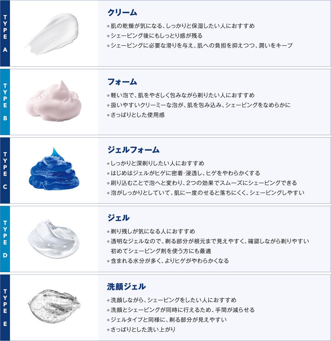 シックでは、ハイドロ シェービングクリームのような「クリームタイプ」のシェービング剤のほか、フォーム、ジェルフォーム、ジェル、洗顔ジェルなど、様々なタイプを取り揃えています。それぞれタイプごとの特徴を参考に、自分の肌質やライフスタイルに合わせたシェービング剤を選びましょう。