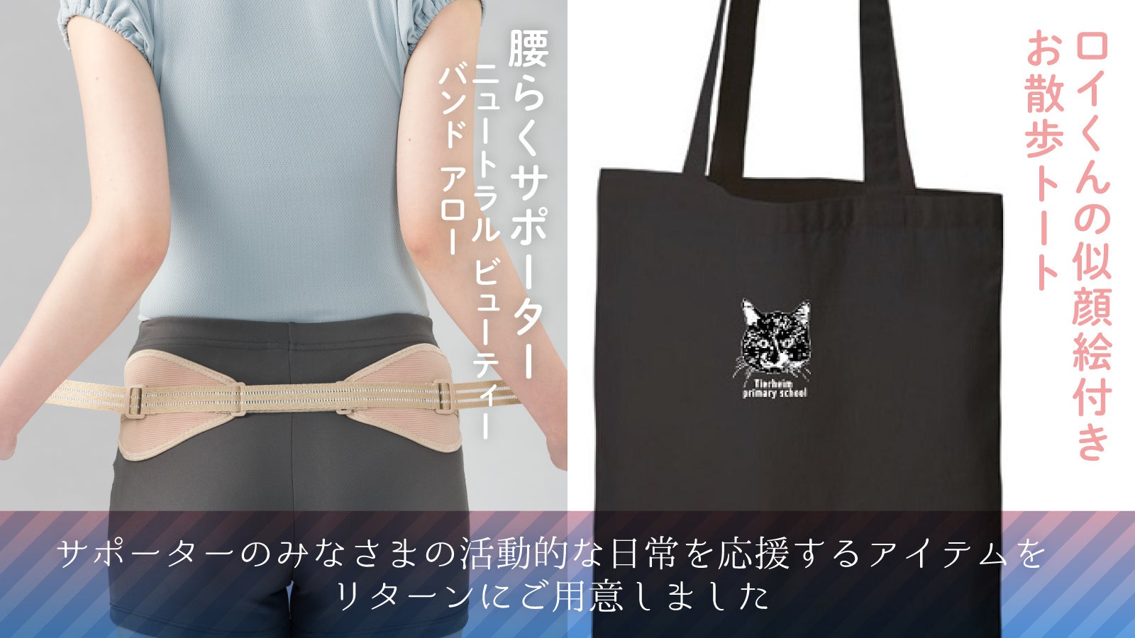 リターンは、ニュートラルビューティーバンドアローとティアハイム小学校の特製オリジナルお散歩トートバッグのセットです。