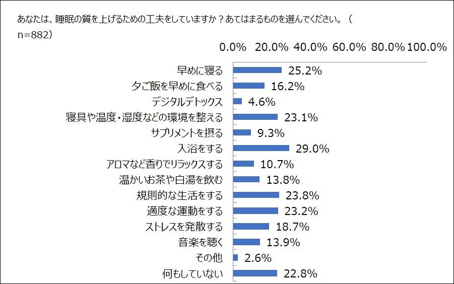 次に睡眠の質を向上させるためにしている工夫を選んでもらいました。(複数選択のため、合計が100%にはなりません。)最も選ばれているのは「入浴をする」、次が「早めに寝る」、その次は「規則的な生活をする」の順で、身近にできることから工夫している人が多いようです。最近市場を伸ばしている睡眠市場ですが、「サプリメントを摂る」を選んでいるのは9.3%で約1割に迫りました。一方で「何もしていない」と答えた人は、22.8%でした。