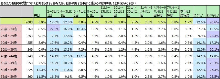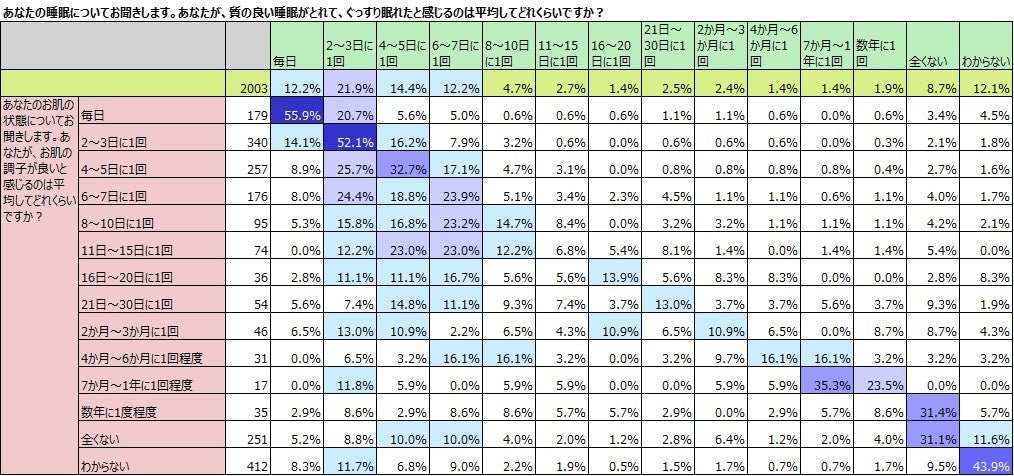 質の高い睡眠の頻度と肌の調子の頻度についての回答を掛け合わせてみました。「毎日」ぐっすり眠れる人は、55.9%と6割近い人が「毎日」肌の状態が良いと答え、「2~3日に1回」ぐっすり眠れる人は、「2~3日」に1回肌の調子が良い人が52.1%でした。ぐっすり眠れるのが「全くない」と答えた人のみ、肌の調子が良い頻度が「数年に1回」が、31.4%で「全くない」が31.1%でほぼ同率でしたが、それ以外の頻度の人が、すべて最も多いボリュームゾーンがリンクしました。睡眠と肌の調子が関連していることはなんとなく予想できていましたが、これほどにリンクすることは驚きでした。
