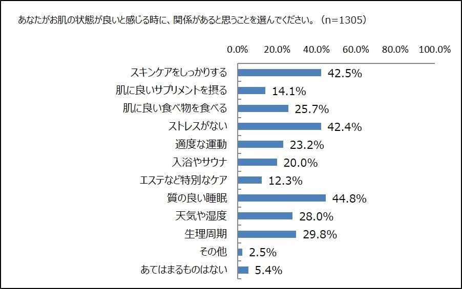 頻度を問わず、肌の調子が良いと感じる日があると答えた人に、肌の状態と関連すると思うものを選んでもらいました。上位3つは近似値ですが、1位は「質の良い睡眠」44.8%で、「スキンケアをしっかりする」の42.5%を超えました。3位は「ストレスがない」で42.4%でした。
