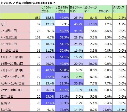 睡眠に悩みがあるか否か聞きました。「とても悩みがある」15.8%と「まあまあ悩みがある」42.9%を合わせて58.7%と約6割の人が、睡眠の悩みを抱えていることがわかりました。年齢別に見てみましたが、年齢による傾向や割合の変化はほとんど見られませんでした。 睡眠の悩みと快眠の頻度を掛け合わせてみました。快眠が「毎日」取れていると答えた人は、「あまり悩みがない」40.2%と「全く悩みがない」37.8%を合わせて78%と約8割の人が悩みがないと答えています。最もボリュームゾーンである「2~3日」は、悩みがある派が44.8%、悩みがない派が51.8%で拮抗しています。「4~5日に1回」となると、悩みがある派が66.2%で、悩みがない派が31.3%と大きく逆転し、ぐっすり眠れる頻度が低くなると、悩みがある人の割合がどんどん増えていく傾向があります。