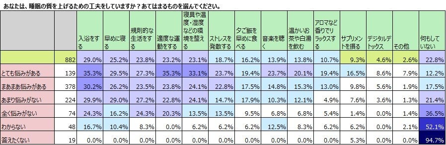 また、睡眠の質を上げるために工夫していることと、睡眠の悩みについて掛け合わせてみました。やはり、睡眠に悩みがある人の方が多くの工夫をしていることがわかります。睡眠の質を向上させるためのサプリメントは、近年、脚光を浴びている比較的新しいサプリメントですが、「とても悩みがある」16.5%と「悩みがある」9.8%を合わせて26.3%が摂取しているようです。