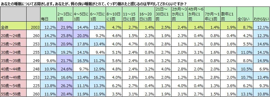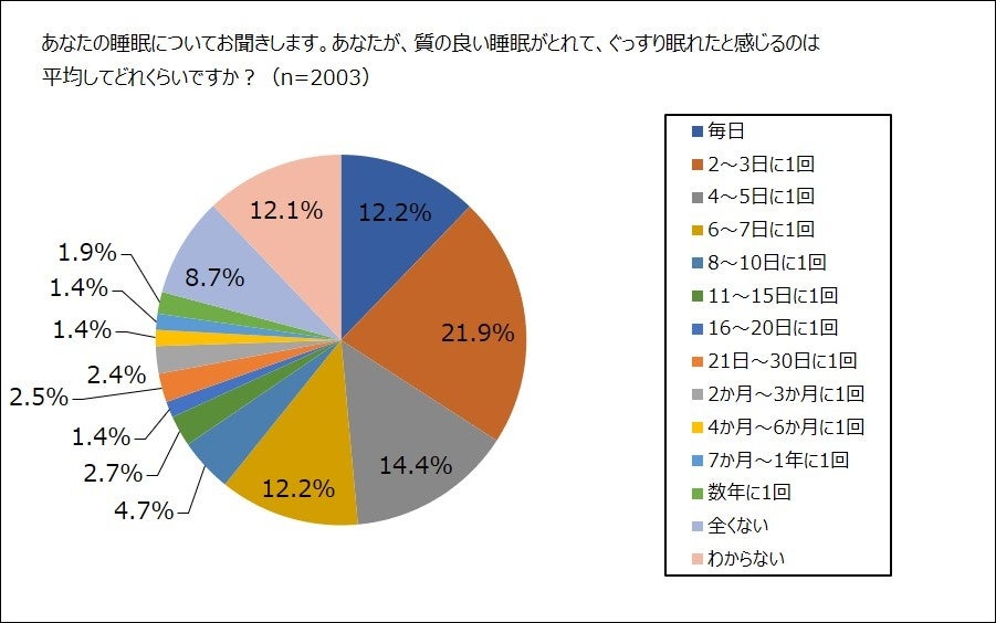 20歳から59歳の全国の女性2,003名にどれくらいの頻度で、質の良い睡眠がとれているか聞きました。最も多いのは「2~3日に1度」で、21.9%。次に多いのが「4~5日に1度」で14.4%でした。「毎日」と答えた人は12.2%にとどまりました。「わからない」人も12.1%と多く、「全くない」人も8.7%でした。「わからない」12.1%の人を除き、1週間以上に1度の頻度と答えた人を合わせると27.1%で、約3割の人が1週間に1度もぐっすり眠れていないことがわかります。