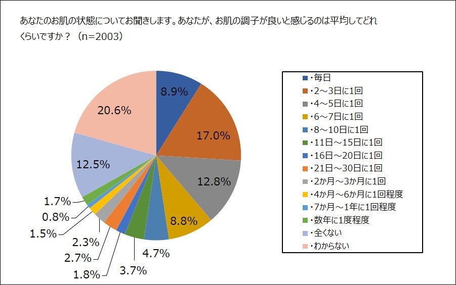 「肌の調子が良い」と感じる頻度の最多は、「わからない」で2割超。次いで「2~3日に1度」17%。