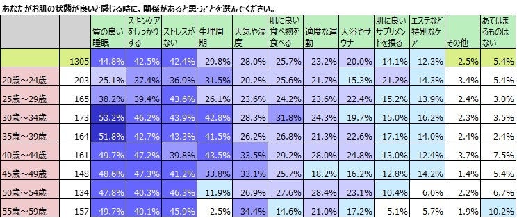 これを年齢別で見てみました。1位の「質の良い睡眠」は30歳以上では約5割になりますが、20歳~24歳では25.1%、25歳~29歳では38.2%と若年層が少ないことがわかりました。「スキンケアをしっかりする」では、若年層の割合が若干少ないものの年齢による差はほぼありません。「ストレスがない」もほとんど差がないようです。「生理周期」は30歳~44歳の世代で4割を超える人が選んでいます。「天気や湿度」も大きな差はありませんが、比較的年齢が高いほど選んでいる人が多い傾向です。20歳~24歳の若年層が選んでいる割合が多いのは、「肌に良いサプリメントを摂る」で、21.2%と2割を超えています。
