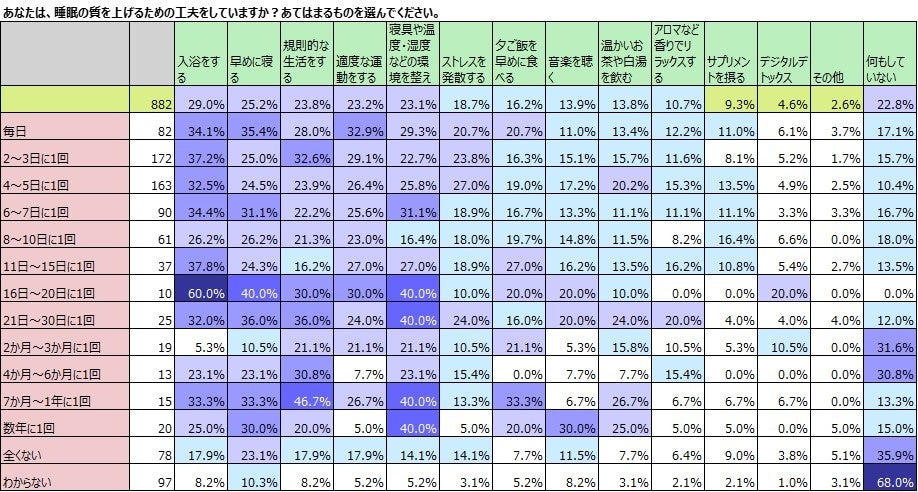 次に、快眠の頻度と、睡眠の質を上げるための工夫を掛け合わせてみました。「毎日」ぐっすり眠れている人は、「早めに寝る」を選んでいる割合が35.4%と平均の25.2%と比べて10ポイント以上多く、「適度な運動をする」も32.9%と平均の23.2%よりも10ポイント近く多い割合です。その他の「入浴をする」「規則的な生活をする」を含め、13の項目の中で11の項目で平均を上回っています。最も多い割合の「2~3日に1回」の割合でぐっすり眠れている人も、選んでいる項目が多く、特に「入浴をする」は37.2%と、毎日ぐっすり眠れている人よりも多い割合でした。9つの項目で、平均以上の割合の人が選択していました。次いで多い割合の「4~5日に1回」の人も選んでいる項目が多く、11の項目で平均を上回っていました。快眠の頻度が減ってくるとn数も少なくなってくるので、参考値と考えますが、頻度が少ないと、睡眠のために実施していることも少なく、平均を超えている項目も少なる傾向があります。快眠の頻度が「全くない」の人は、ある程度のn数がありますので分析してみると、「その他」の項目以外はすべての選択肢で平均を下回ります。「サプリメント」の項目で見てみると、平均は9.3%ですが、「2~3日に1回」を除く、「毎日」から15日以内に1回の割合で眠れている人が平均を上回っているのに対し、16日に1回以上の割合でしか眠れていない人はすべて、平均を下回っています。全く眠れていない人のサプリメントの摂取は9.%で、「毎日」眠れている人よりも少ないことがわかりました。