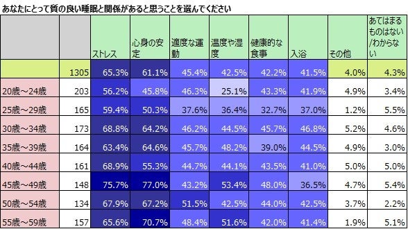 これを年齢別に見てみると、1位の「ストレス」に関しては20歳~29歳では6割を切っており、30歳以上になるとすべての世代で6割を超えています。なかでも45歳~49歳の世代では75.7%と8割近い人が関連があると答えています。続く「心身の安定」についても同様で、20歳~29歳では約5割ですが、30歳以上は6割を超え、45歳以上で7割を超えてきます。この項目でも、45歳~49歳の人が最も多く、8割に迫ります。「温度や湿度」を選んでいるのも年齢が高いほど割合が増えています。「適度な運動」・「健康的な食事」・「入浴」などを選んでいる割合は年齢による差がないと考えられます。全体的に年齢が高いほど、関連があるものを多く選んでいるようです。