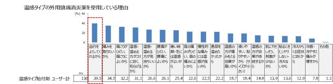 20~60代の男女を対象に当社が実施した調査(*1)によると、1年以内に外用鎮痛消炎薬を購入した人のうち約5人に1人が温感タイプを購入していることが分かりました。温感タイプを購入している人は、「効果の高さ」を期待している一方で、「血行をよくしてくれる」なども期待して使用する傾向にあることが分かりました。