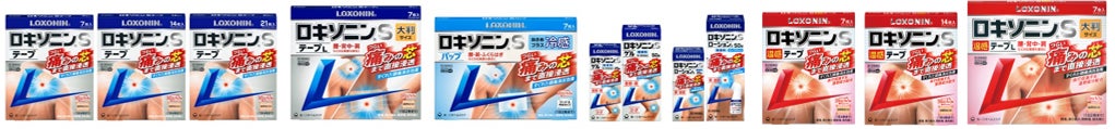 左から、「ロキソニンSテープ」7・14・21枚入、「同 テープL」7枚入、「同 パップ」7枚入、「同 ゲル」25・50g、「同 ローションa」25・50g、「同 温感テープ」7・14枚入、「同 温感テープL」7枚入(いずれも第2類医薬品)