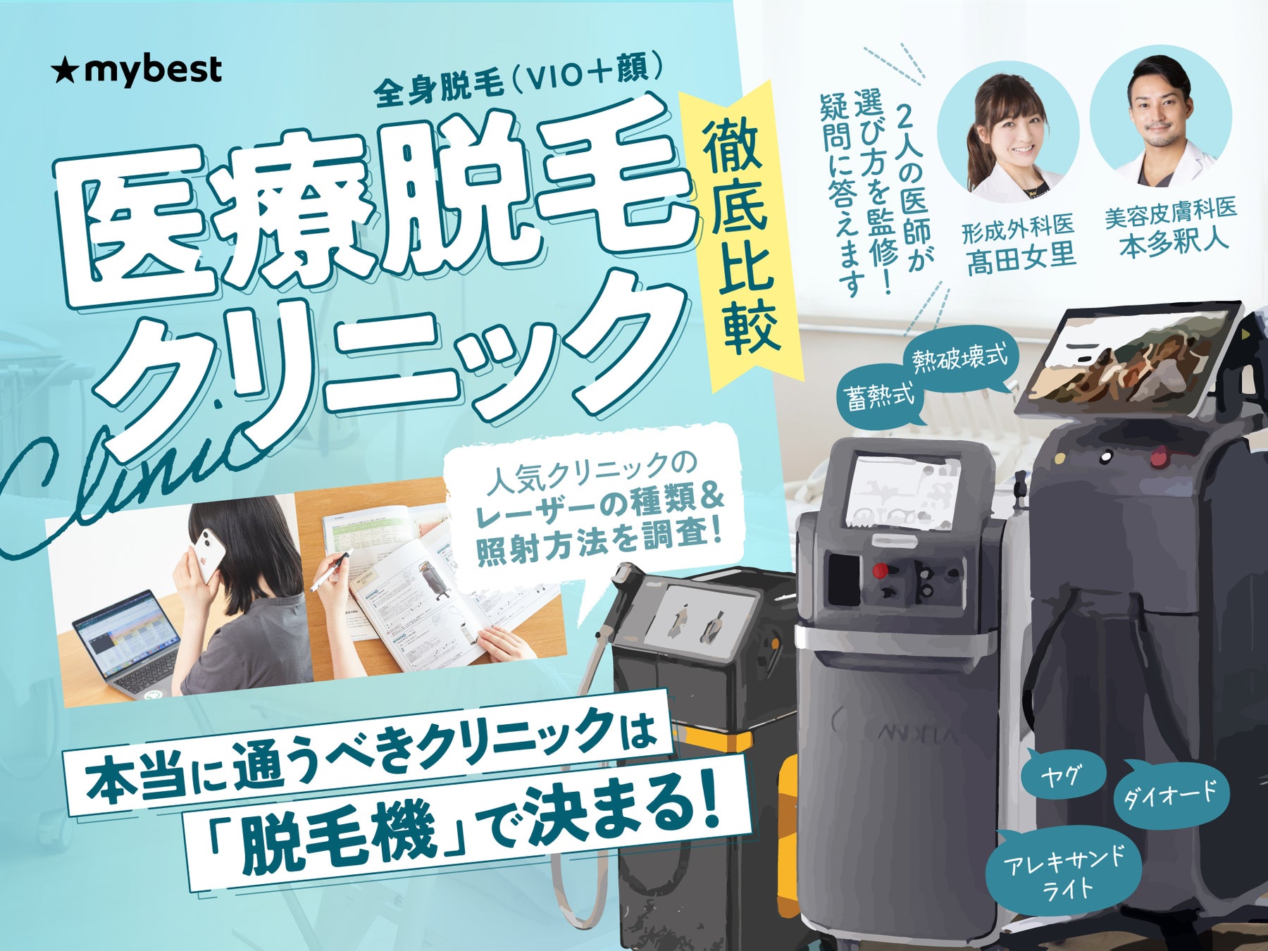 mybestでは、VIO・顔込みの全身脱毛5回コースの料金が安く、複数のレーザーを照射できる通いやすいクリニックを優れた医療脱毛クリニックと定義しています。