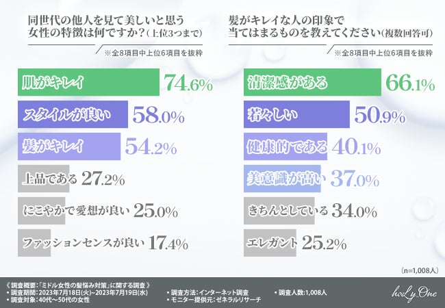 一方で、『髪がキレイ』と回答した方も半数以上いたことから、ミドル女性の“キレイの決め手”は肌と髪がポイントのようです。