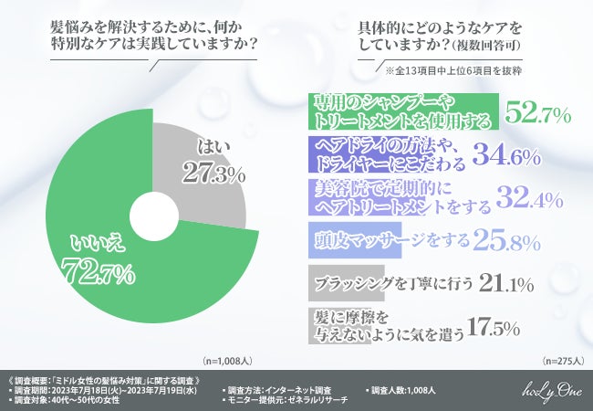 そこで、パーソナライズ頭皮ケア『hoLy_One(ホーリーワン)』https://www.holy-one.jp/)を運営する株式会社アクアネットは、40代~50代の女性を対象に、「ミドル女性の髪悩み対策」に関する調査を実施しました。