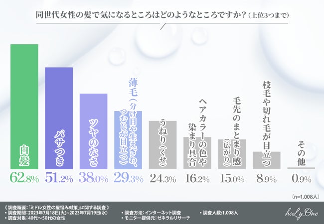 今回の調査では、若い頃には無かった白髪やくせ毛、うねりといった「髪質の変化」に悩んでいる40代~50代の女性が多いことが明らかになりました。
